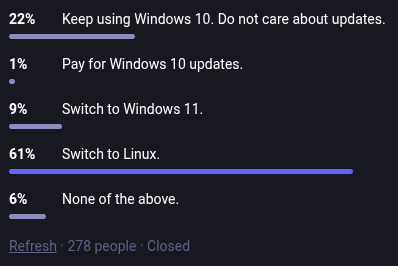 Only 9% plan to move to Windows 11. 1% plan to pay for updates. 22% want to keep using Windows 10, even without security updates. 61% plan to switch to Linux. 6% plan something else.